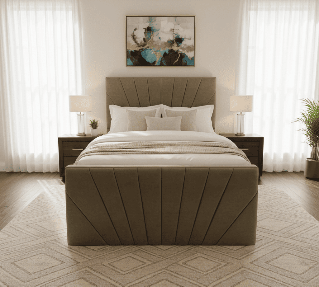 Luxury velvet upholstery, striking fan-stitched design, transforms any bedroom instantly.